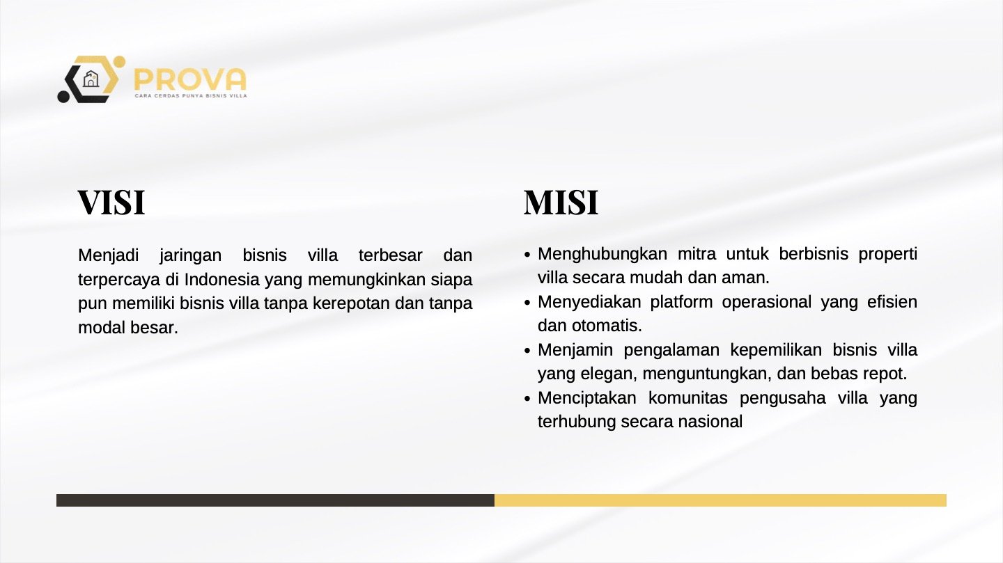 PROVA adalah sebuah platform bisnis villa berbasis sistem kemitraan (partnership) yang memungkinkan siapa saja menjadi bagian dari ekosistem bisnis properti hospitality tanpa harus membeli aset, mengelola langsung, atau menghadapi kompleksitas industri properti.